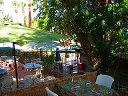 We dined under this kumquat tree. A young man seats us at a table surrounded by leafy shade trees with birds performing operas in the fragrant lemon tree. Someone brings us coffee and we are told to help ourselves at the Sunday brunch buffet. We can choose from a hundred or so different dishes like ham and melted cheese quiche with a crumble topping, some kind of luscious spinach, feta, noodle dish, carne asada, bacon, sausage, Spanish rice, homemade refried beans, country potatoes, blueberry cobbler, coconut cake, and brownies.
